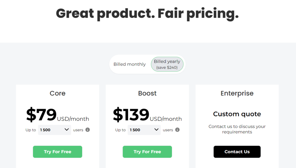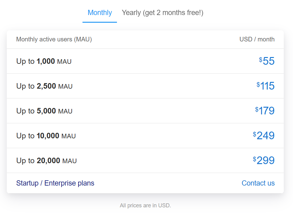 HelpHero’s prices start at $55 per month for up to 1,000 active users, with the highest price at $299 per month for up to 20,000 users. They offer custom plans for startups and enterprises upon request. You can choose a yearly plan with two months free and a 14-day free trial.