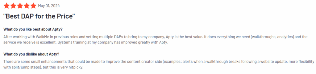 - Apty is great at providing data and tracking usage, which helps administrators understand how users behave.
