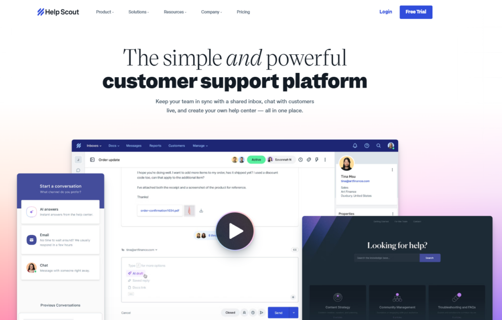HelpScout is a customer support platform designed to help businesses manage customer support and communicate between companies and customers through multiple channels- email, live chat, and a self-service knowledge base. It is quick to set up, with a user-friendly interface, and allows teams to manage all support interactions in one unified platform.