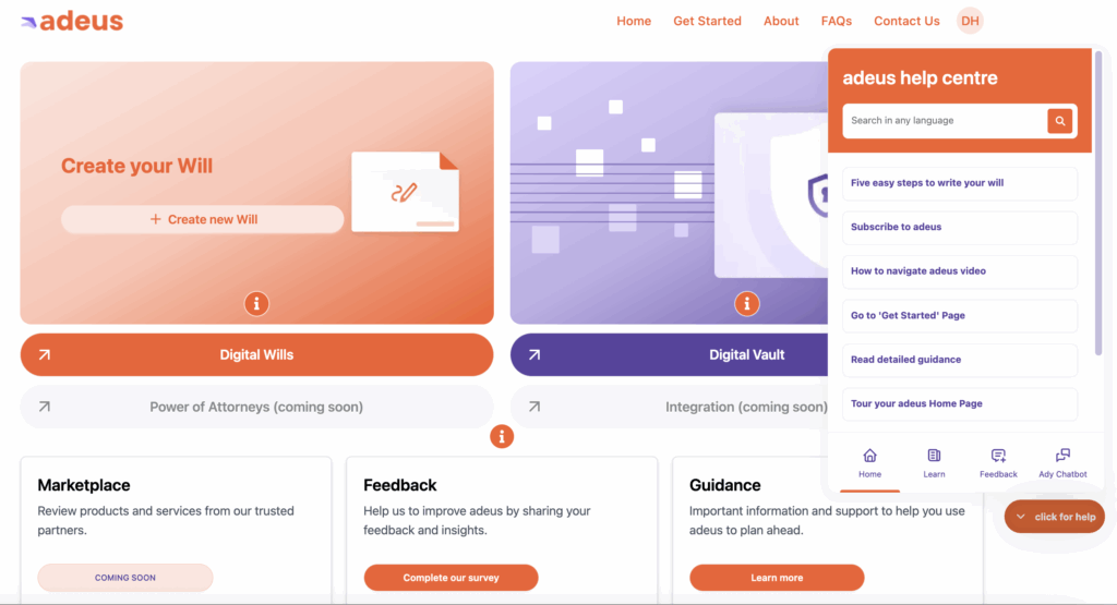 Once inside, Hints respond to user actions. They offer context for adeus's two main products, Digital Will and Digital Vault, helping users understand what they're seeing.