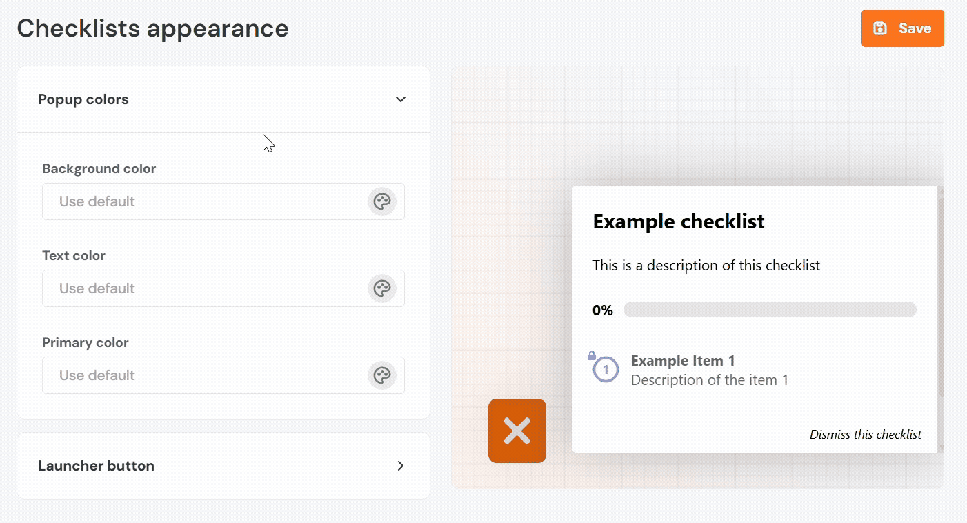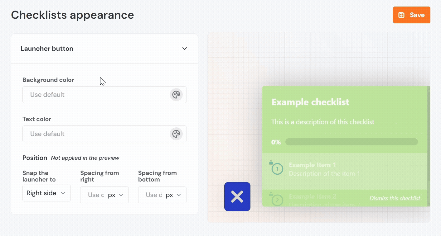 - Background Color: Sets the background color of the floating launcher button that opens the checklist.