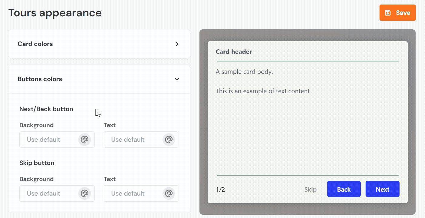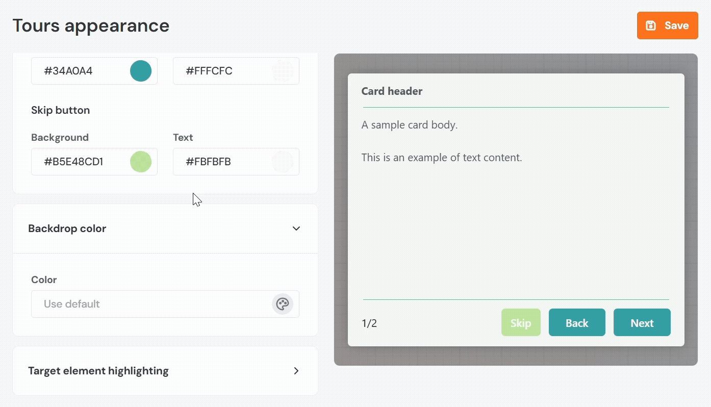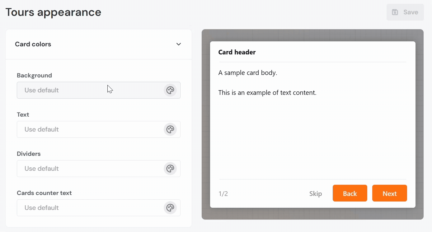 - Background: Sets the background color of the tour step card.