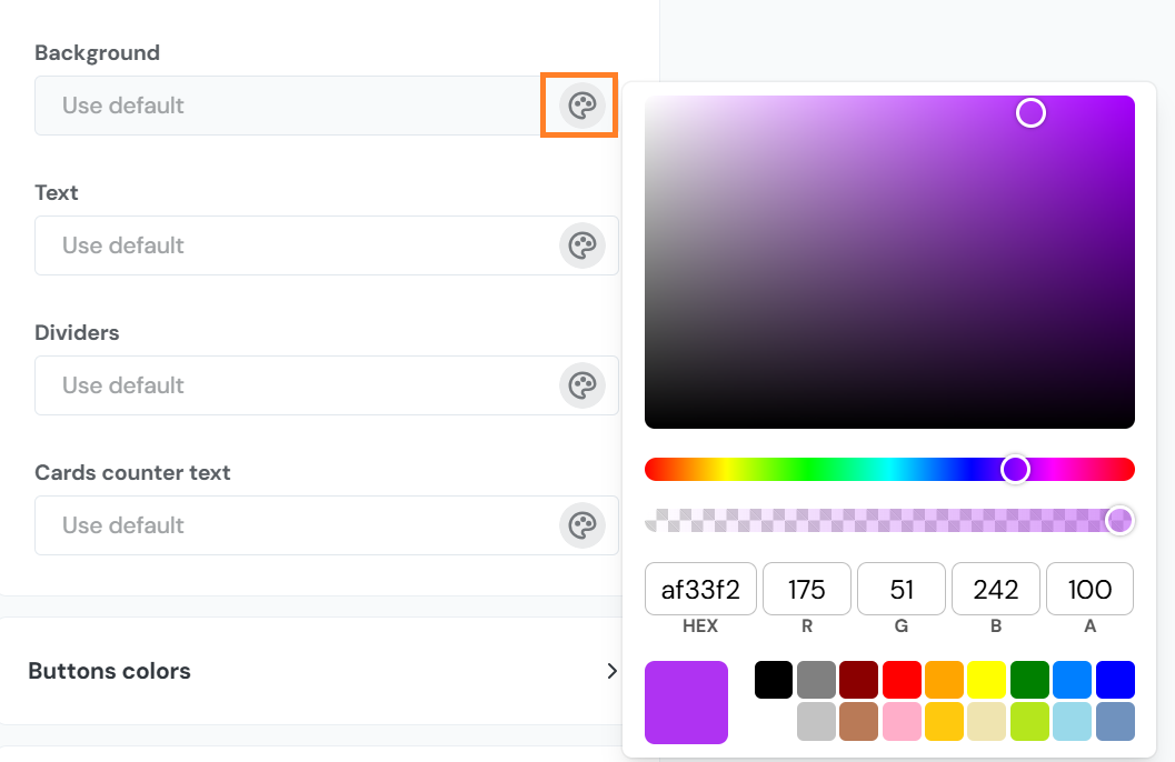 All color settings in the Branding section can be adjusted by clicking on the palette icon next to each field. This opens a color picker where you can manually select a shade using the gradient scale, or enter a specific color value using HEX or RGB codes. Below the color scale, there is also a transparency slider that allows you to adjust the opacity of the selected color.
