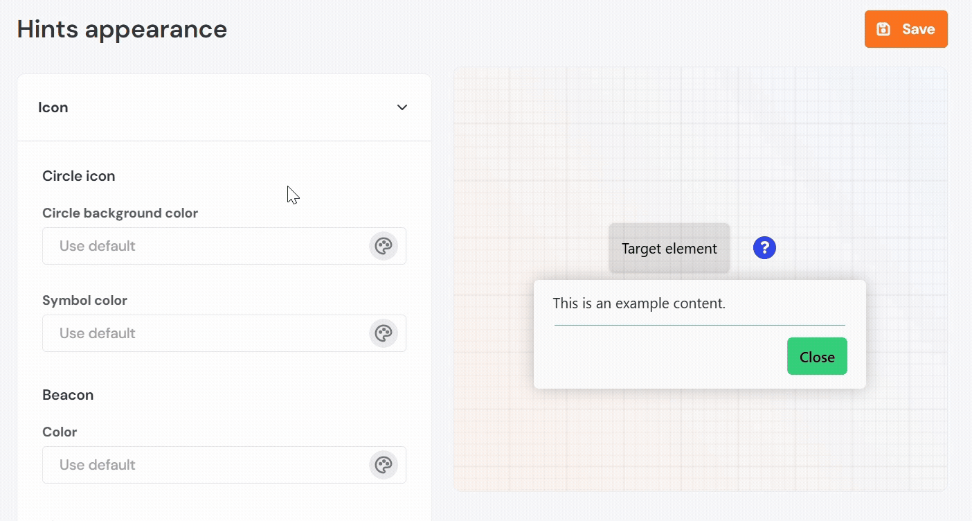 - Beacon Color: Defines the color of the pulsing animation used to draw attention to the hint.