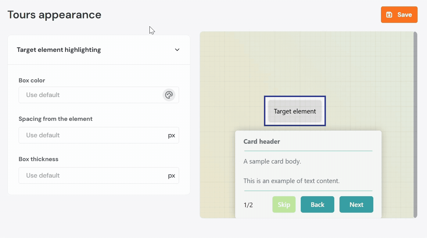 - Box Color: Sets the outline color that appears around the highlighted UI element during a tour step.