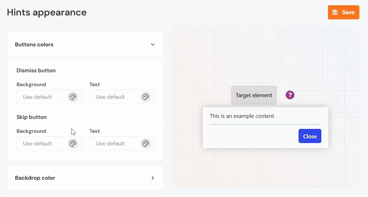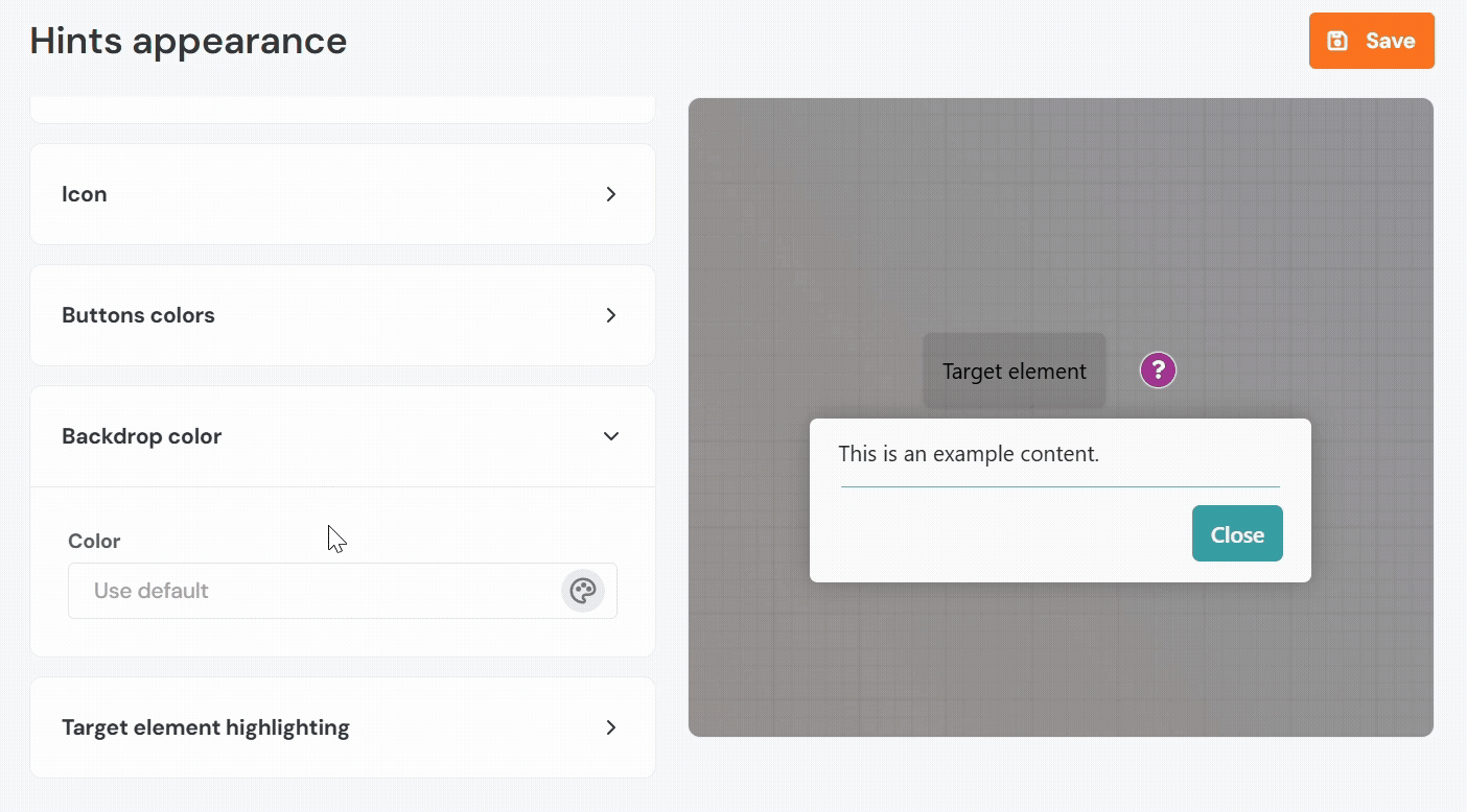 - Color: Defines the overlay color that appears behind the hint, if enabled.