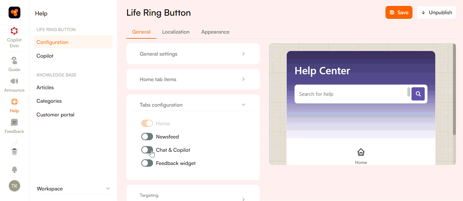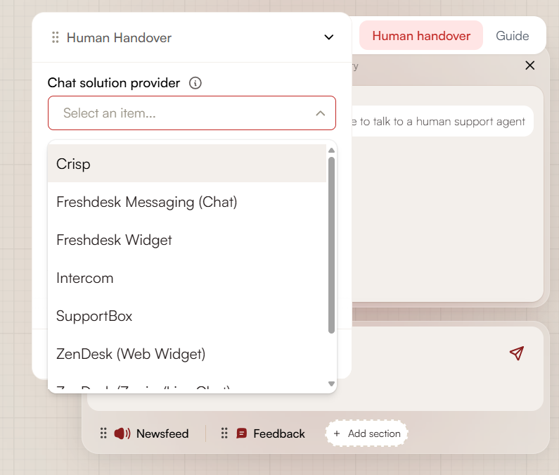 You can configure the chat to appear as a separate button in the widget (so users can access support anytime), or make it accessible only through Elvin Copilot (when users specifically ask for help).