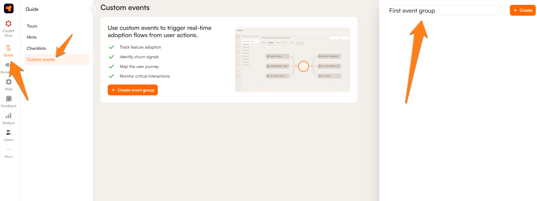 First, navigate to the Guide users section of Product Fruits and select "Custom Events." Here, you can create your first custom events group by clicking + Create event group and adding a title.