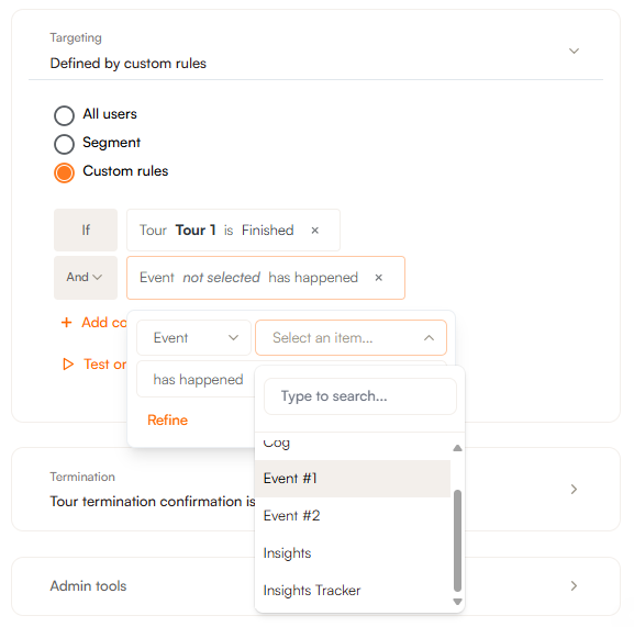 By adding the rule that this event hasn't happened yet, you can trigger a tour to nudge the user to explore features that they have been missing until now.