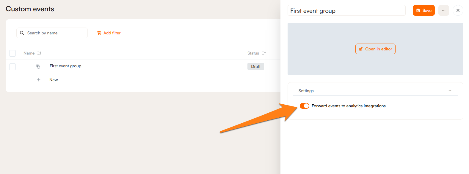 If you have analytics integrations set up, you can have these custom events analytics forwarded to those integrations by enabling this toggle in the event group settings.