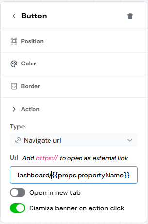 In addition to the URL templates and filters, specific placeholders can also be used in other parts of Product Fruits, such as in call-to-action buttons or hyperlinks. Here, the syntax changes slightly. Instead of using the [d.props.propertyName] format, you should use double curly brackets {{}}. For example, to refer to a custom property, you would use {{props.propertyName}}. To refer to a built-in property like the username, you would simply use {{username}}.