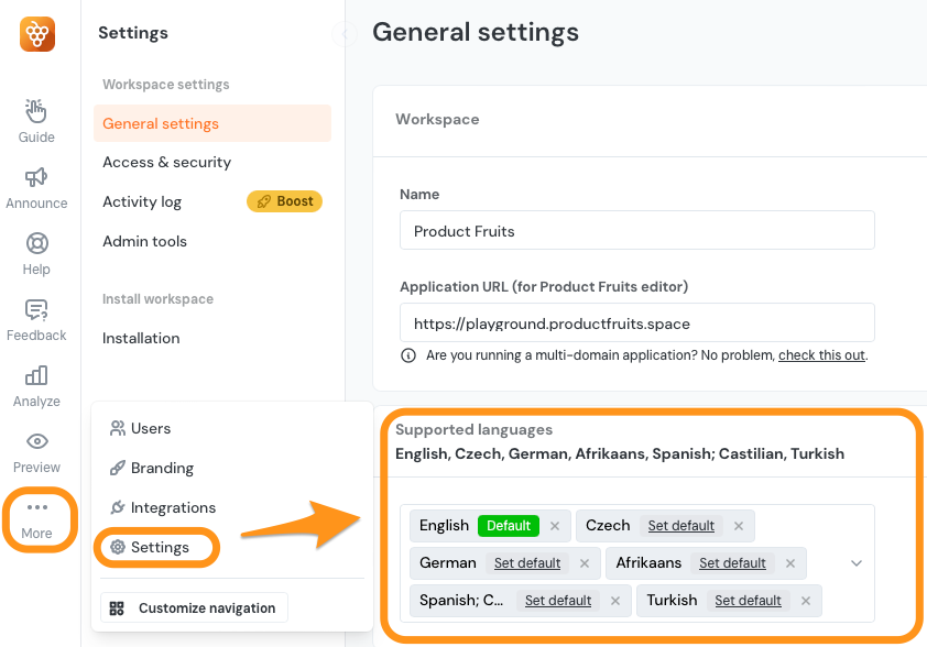 First, go to the Workspace settings (Click on the More icon on the bottom left menu and then Settings) and find the Supported languages section. Add all the languages you want supported in Product Fruits. This should match the languages supported by your application (unless for any reason you're wanting to support fewer languages in Product Fruits than in your application).