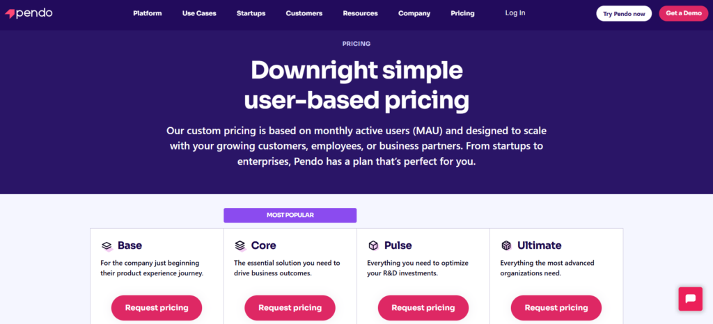 Most paid Pendo plans (except for the Starter plan) require you to request a quote for pricing. The company does not provide price ranges on its website.