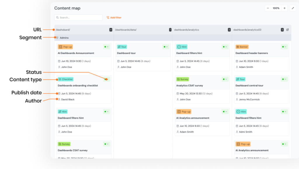 Content Map: The feature gives you an easy view of all your onboarding content. You can manage and track what information you send to users, helping you avoid repeating messages and ensuring that the right message gets to each user at the right time.