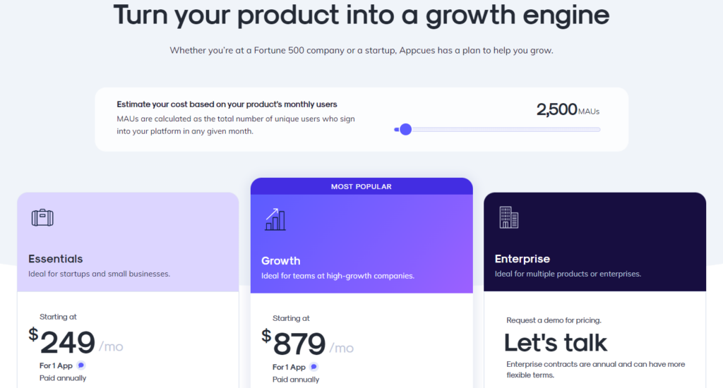 The Essentials plan starts at $249/month and includes features like onboarding flows and basic analytics, whereas the growth plan starts at $879/month and offers custom pricing.