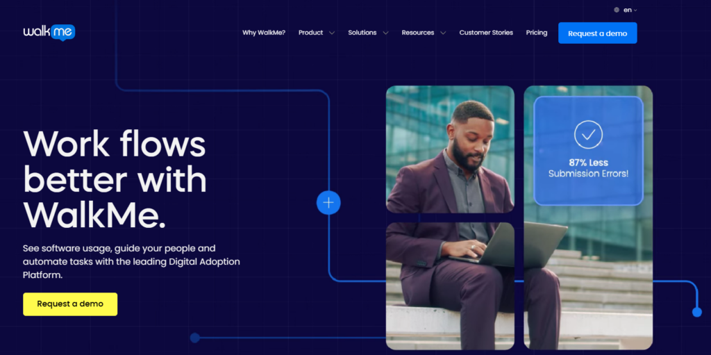 WalkMe is a digital adoption platform designed for large enterprises. It offers in-app guidance, step-by-step walkthroughs, and automated tasks to simplify the user experience. The platform also includes employee onboarding and internal software training alongside customer-facing applications.