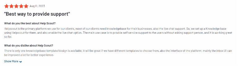 HelpScout is a customer support platform designed to help businesses manage customer support and communicate between companies and customers through multiple channels- email, live chat, and a self-service knowledge base. It is quick to set up, with a user-friendly interface, and allows teams to manage all support interactions in one unified platform.