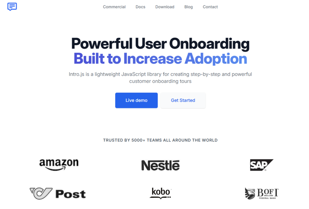 Intro.js is a free, open-source library that helps you create onboarding tours, walkthroughs, and feature introductions on websites and applications. It guides users through new or complex software elements using tooltips or modals. Developers like it because it adds user-friendly guidance without needing a complete digital adoption platform (DAP).