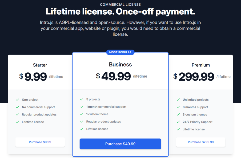 - Intro.js does not offer comprehensive features, such as support for multiple applications, personalized experiences based on user roles, and compliance tracking. This makes it less suitable for companies with complicated workflows.