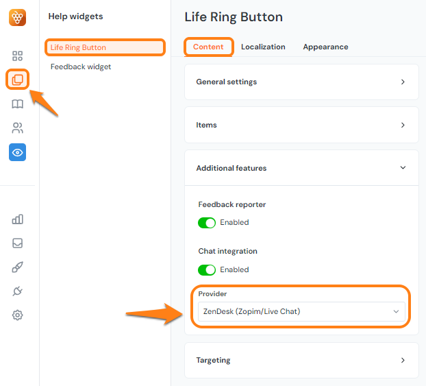 Step two: Turn on the chat integration. You do this by heading over to the Help Widgets section and choosing “ Life Ring Button”/ Then, click to the content tab. You’ll want to enable the “Show Chat Button” checkbox, and select your chat provider.