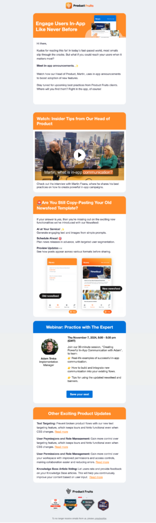 This new announcement email showcases the Product Fruits newsfeed, a powerful tool transforming how teams communicate product updates.