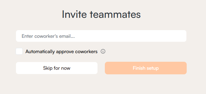 If you select the Automatically approve coworkers option, any team members using the same company email domain as you will automatically gain access to the workspace without requiring your approval. But don’t worry, team members can be invited at any point. If you prefer to hold off for now, just follow this link.