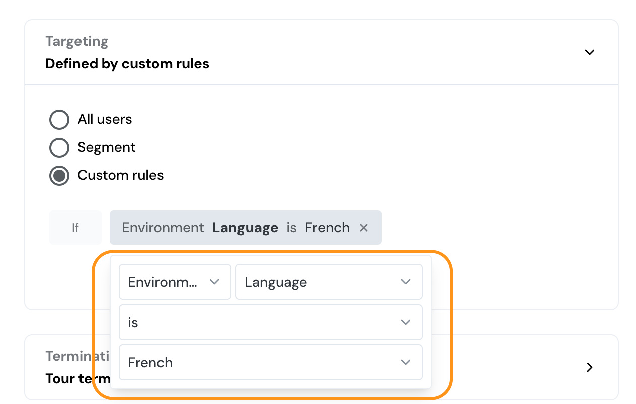 You may want to display different tours/hints for different languages or restrict the tours/hints to certain languages. You can use the Targeting settings in the tour/hints detail for this. Select Custom Rules -> If Environment -> Language , and select the desired language.