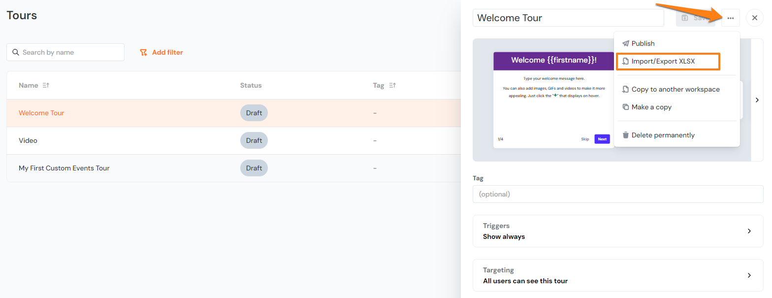 Once it's enabled, you must add a language to your supported languages (if you haven't already, see the top of this article), then you can go to the administration page for a particular tour or hint group. Click the three dots in the top right corner of the page and select 'Import/Export XLSX'. As shown in the image below, you'll want to make sure that no one else on your team is making changes to the Product Fruits content you are exporting at the time of export.