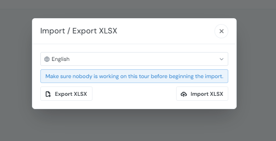 To translate many tour and hint cards at once, you can use the XLSX import/export feature. This is not enabled by default, so you will need to message or email us to activate this feature for you.