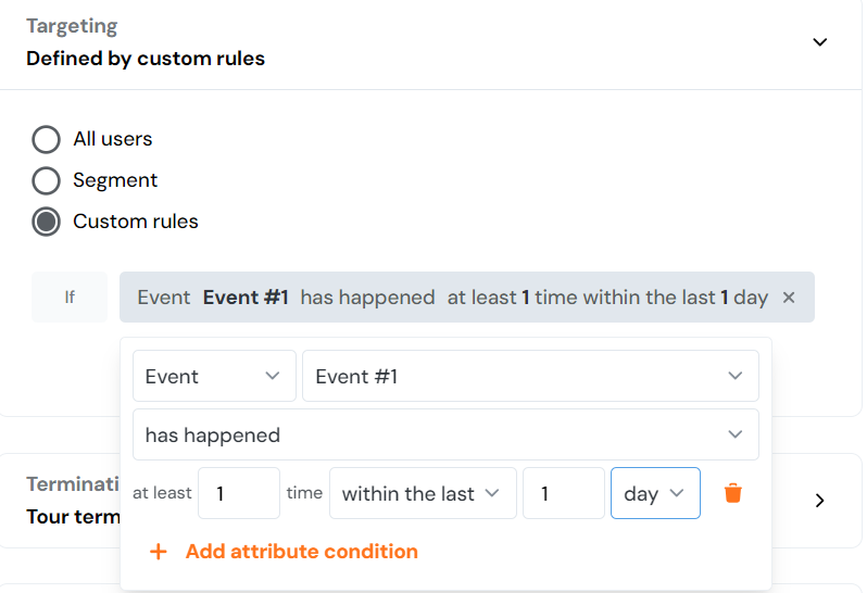 Use the dropdown Add Condition to select conditions like user role, device type, or completion of previous tours. Once your segment is set up, save it and apply it wherever needed.