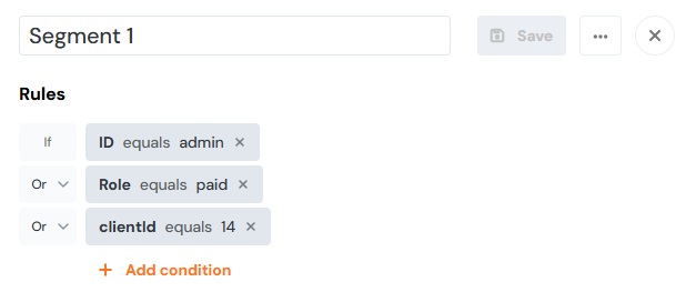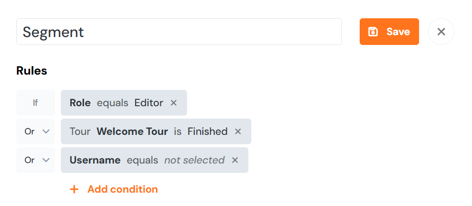 For example, you might create a segment to target users whose role is Editor and who have completed the "Welcome Tour" OR have been on the platform for at least 30 days. This flexibility allows you to create nuanced targeting rules to fit your audience.