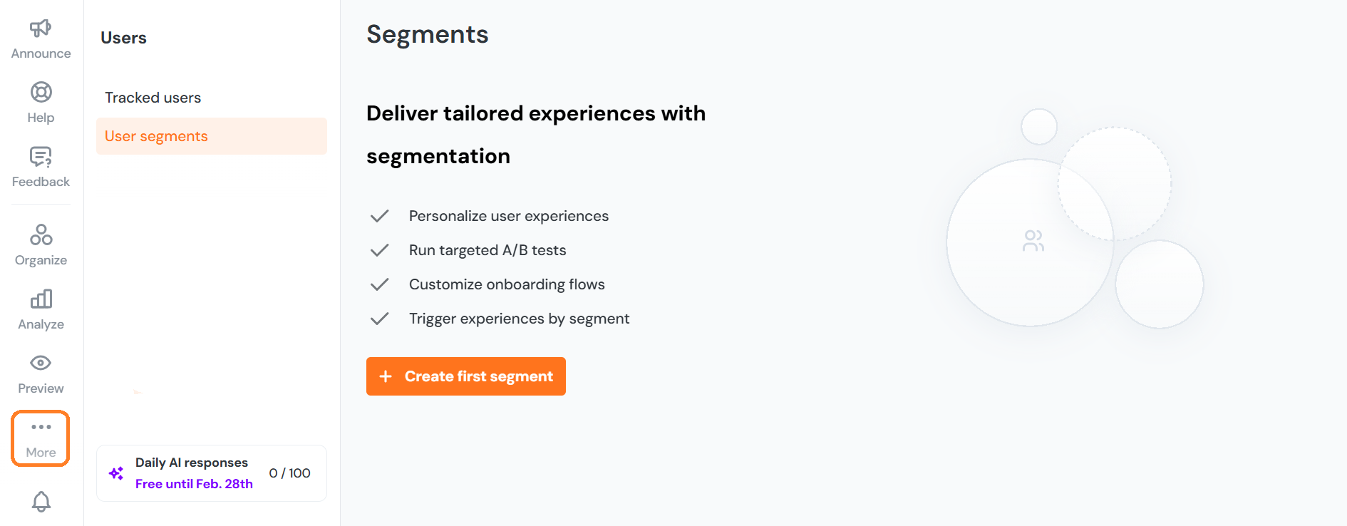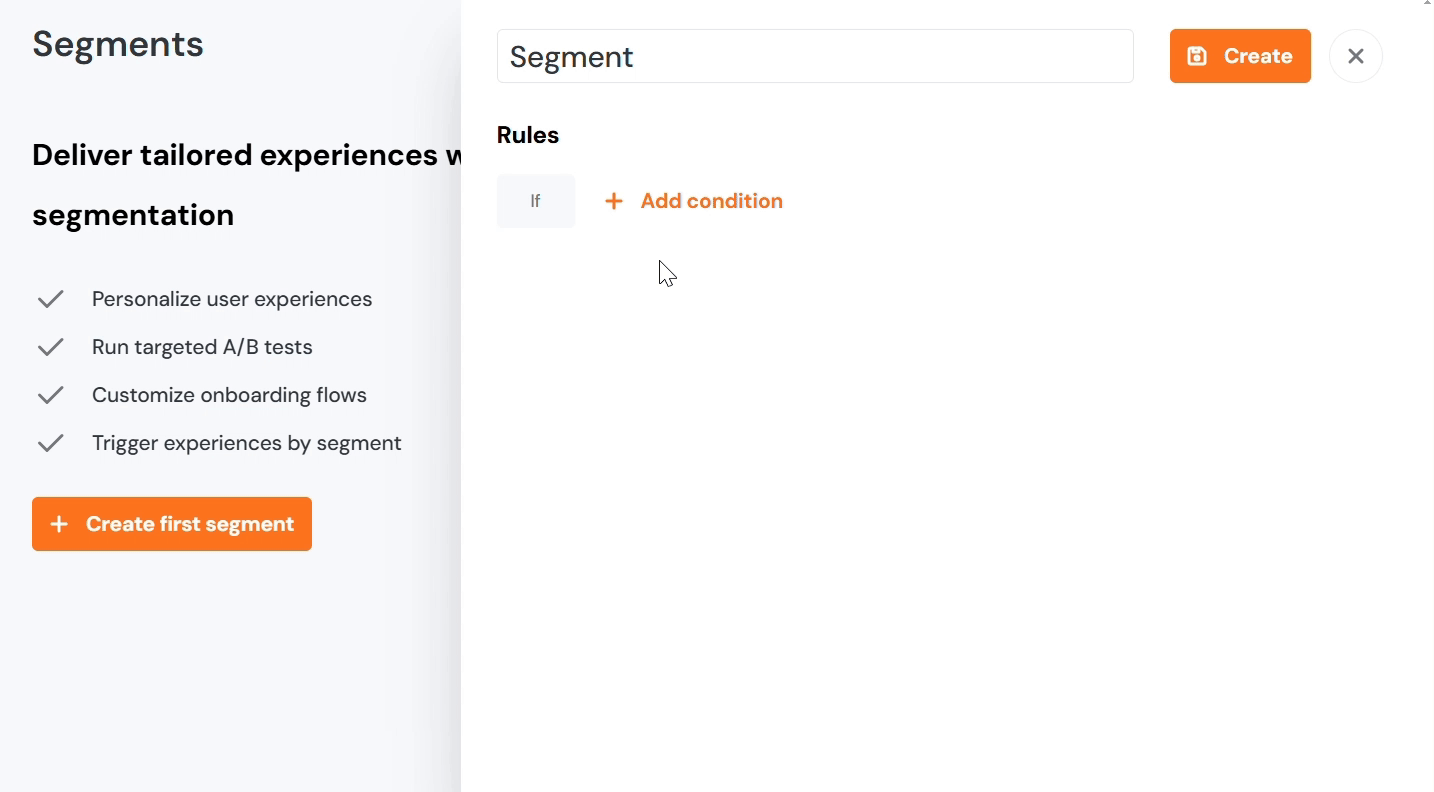 - User Segments: These are saved collections of rules that you can create once and use across multiple pieces of content. When creating a user segment, you define conditions that match a group of users. For example, you might create a segment that targets users who have completed the Intro Tour and have been active for more than 30 days. This segment can then be applied to any future content (like tours or surveys).